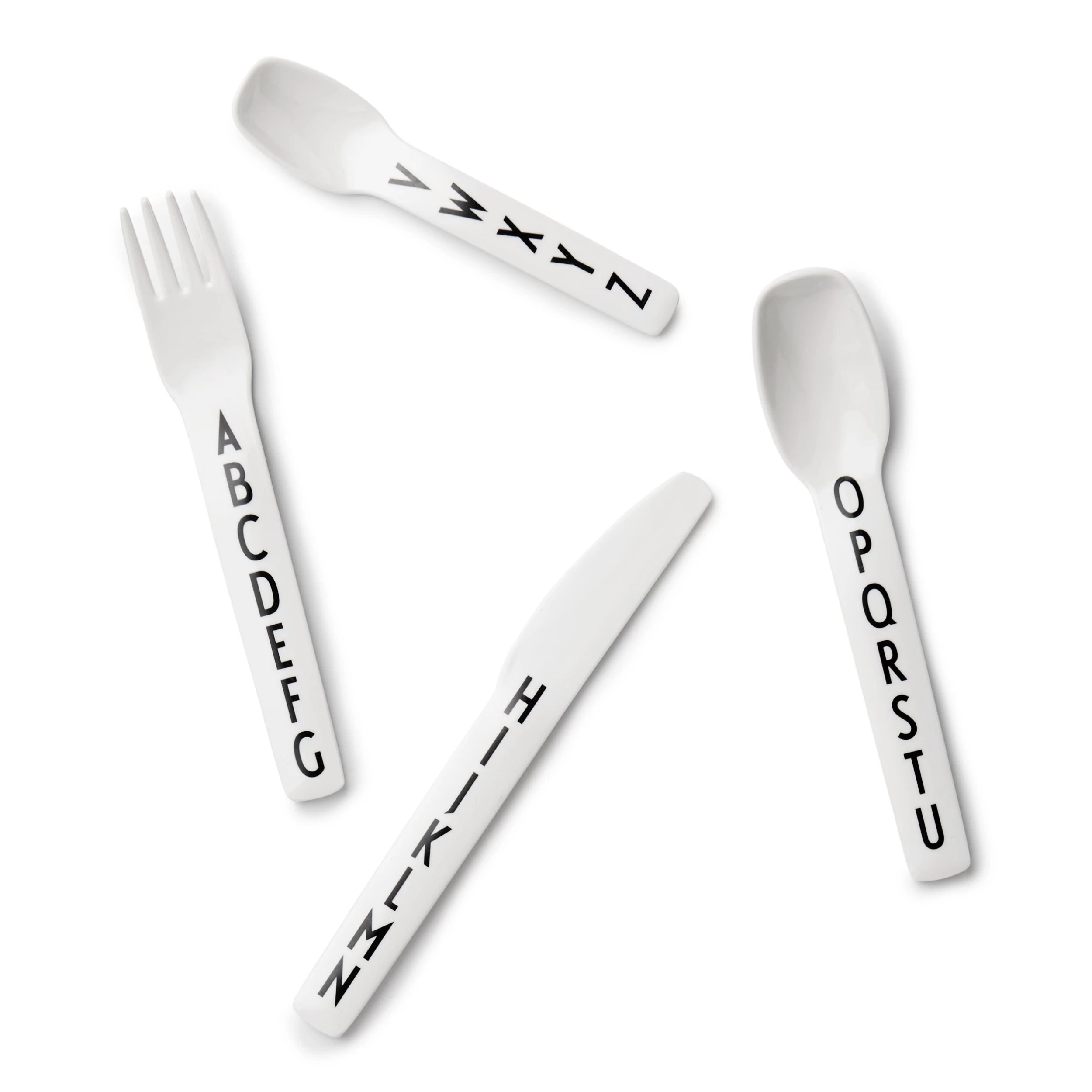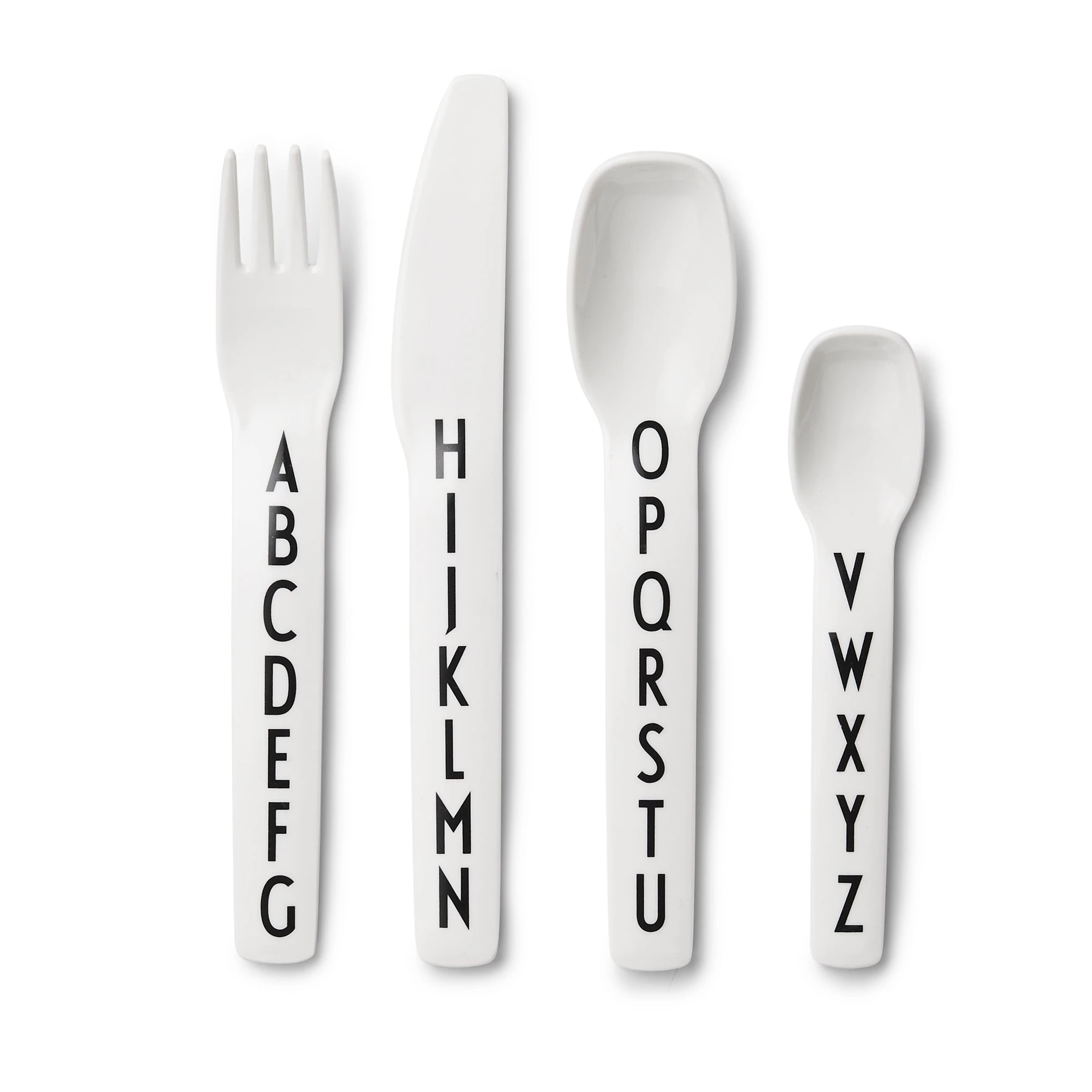 Ces couverts pour enfant en mélamine de grande qualité et pratique sont ornés des lettres de l’alphabet dans la célèbre police d’Arne Jacobsen.